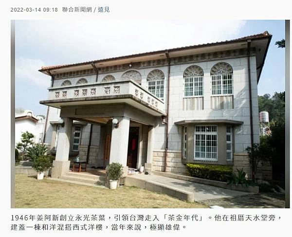 1946年姜阿新創立永光茶葉,引領台灣走入「茶金年代」。他在祖厝天水堂旁,建蓋一棟和洋混搭西式洋樓,當年來說,極顯雄偉。