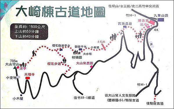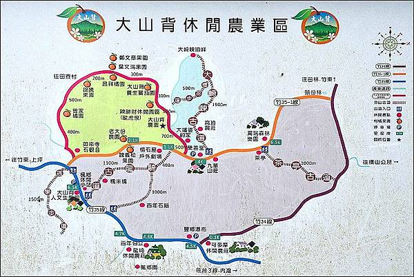 大山背地區的導覽圖,由台3省道轉竹34道路前往,會由右上方頭份林開始行程。