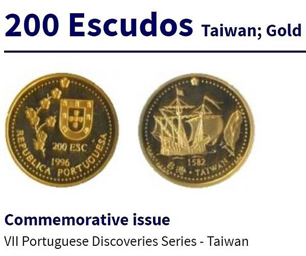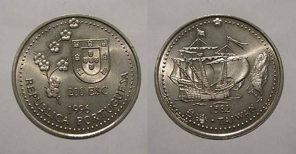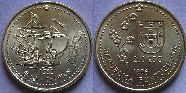 葡萄牙在1996年發行的一枚硬幣200Escudos (200盾銅板),其中特別以1582年葡萄牙人發現台灣作為主題 , 並特別將 Formosa及漢字「台灣」呈現。 這是一個值得分享給大家的事。葡萄牙在加入歐元區以前, 是以Escudos(盾)為通用貨幣。這一個 200 盾的銅幣 , 把葡萄牙人在大航海時代的歷史榮光, 完全呈現。而且也順便紀錄了1582年Formosa (台灣) 進入歐洲的歷史紀錄