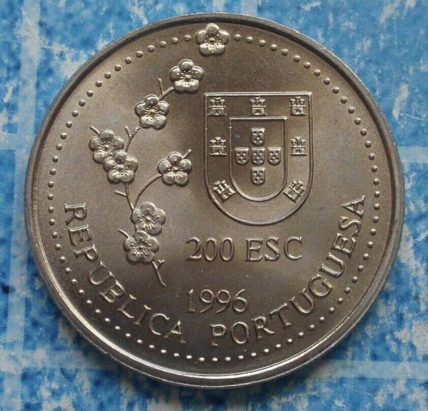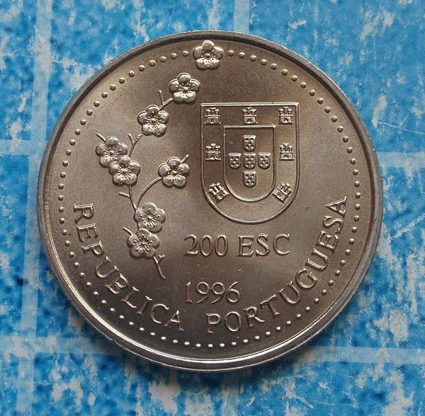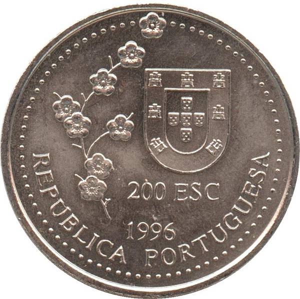 葡萄牙盾(1911-2001)(x)200埃斯庫多(1996年,葡萄牙發現VII系列的一部分)O:葡萄牙徽章(https://pt.wikipedia.org/wiki/Bras%C3%A3o_de_armas_de_Portugal), 價值,梅樹枝和葡萄牙“葡萄牙共和國”/ R:導航caravela,福爾摩沙島地圖(後來的台灣),1582年是葡萄牙航海家在一次沉船事件後登陸該島的年份,該國名稱 中文和葡萄牙文。