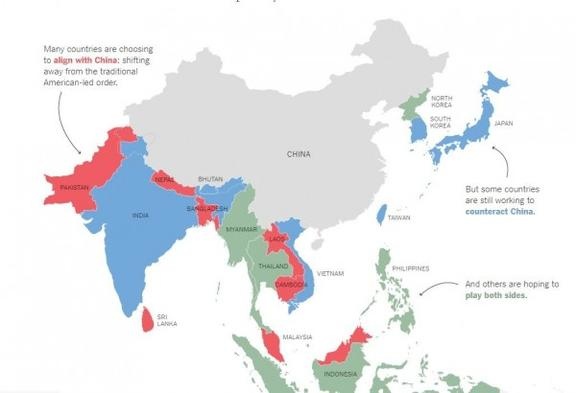 紐約時報(The New York Times)報導,過去5年來,中國越來越強大,在亞洲部分地區已取代美國數十年來享有的霸權地位。該報訪問五位區域專家,進而繪出一幅兩強至今在亞洲爭霸的地圖。