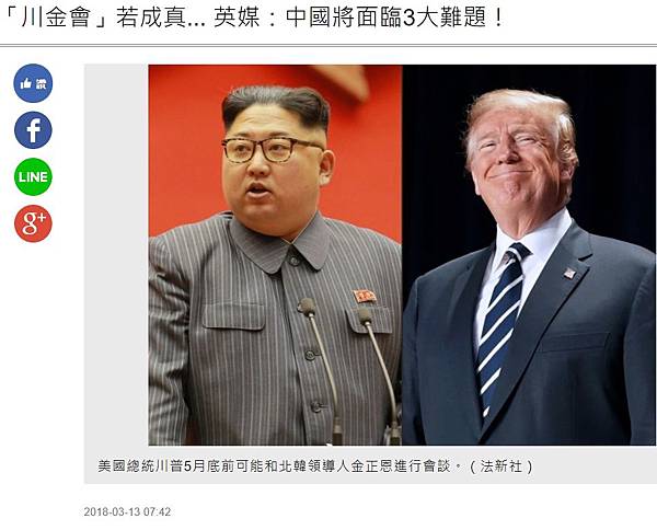 分享「川金會」若成真... 英媒:中國將面臨3大難題!到Facebook 分享「川金會」若成真... 英媒:中國將面臨3大難題!到Line 分享「川金會」若成真... 英媒:中國將面臨3大難題!到Google+