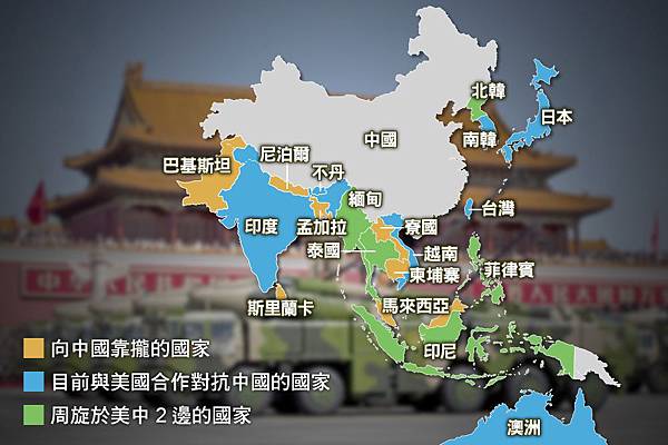 至於綠色則是美中之間遊走的國家,包括菲律賓、泰國、緬甸、印尼,另外北韓也被列入。