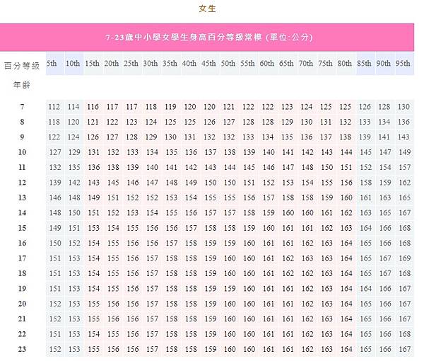 | 166.6-168.8厘米 | 155.9厘米 | 5英尺6.5英寸 | 5英尺1英寸 | 2014年18歲 [73] | |