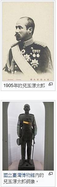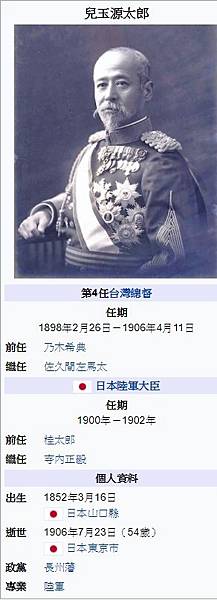 兒玉源太郎(1852年3月16日-1906年7月23日),正二位勲一等功一級子爵(追封伯爵),長州藩的支藩——德山藩出身(今山口縣周南市),台灣日治時期第4任總督(1898-1906)。兒玉在總督任內,也在中央身兼數職(兼任日本內閣陸軍大臣、軍務大臣、文部大臣等職位),更領兵參與日俄戰爭,因此在台灣的時間很短。實際在台灣負責政務的人是民政長官後藤新平,被稱為「兒玉、後藤時代」。