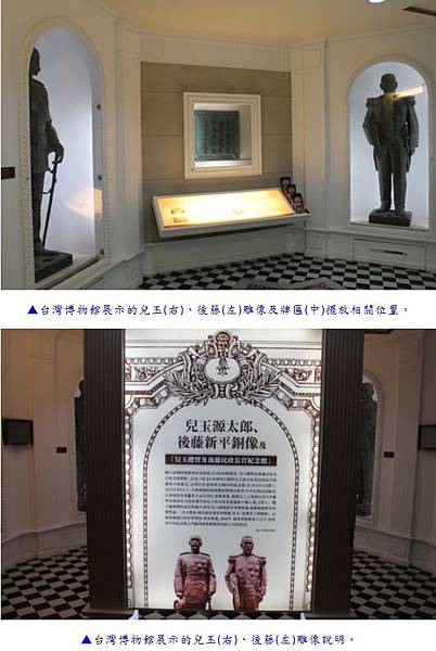 台灣博物館的一樓大廳兩側各有個壁龕,現在是擺放兩個裝飾用大花瓶,在兒玉後藤紀念館時期是放置了兒玉及後藤雕像,光復後兩尊雕像自原位置移出,改列為收藏。