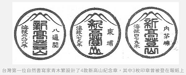 台灣第一位自然書寫家青木繁設計了4款新高山紀念章,其中3枚印章曾被登在報紙上。