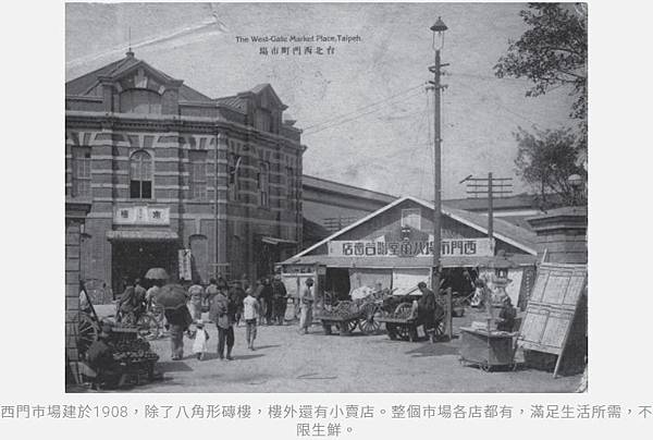西門市場就是今天西門町的古蹟西門紅樓,建於1908年,也稱新起町市場,可說是台北日本人的廚房,生活的食材、用具,應有盡有。
