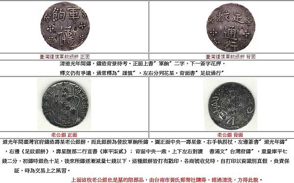 當時官員似乎參考了外國番銀的作法,在幣面上印刻圖案,差別在於將其改為中國傳統紋樣,因此便以圖案來稱呼3種紋銀:「壽星、花籃、劍秤」。其中,壽星圖樣較為常見,幣面上印刻「道光年鑄」、「足紋銀餅」等字,這樣看來,連橫所稱咸豐3年「林恭之變」時鑄造的說法可能有誤,觀諸文獻,應該是在道光12年(1832)「張丙之亂」時鑄造的。