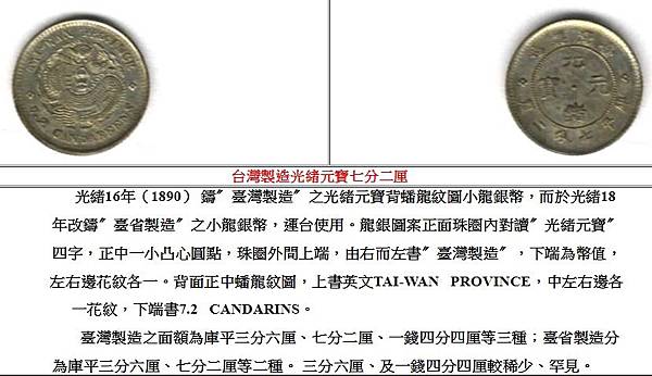 台灣貨幣/紙幣銀幣硬幣“台灣製造”“台省製造/台灣硬輔幣/五角/台灣銀幣:同治壽星/台灣製造七分二厘銀元/台灣鑄造的“光緒元寶”銀幣均為銀毫輔幣,根據其面文不同可分為兩種版別:一是“台灣製造”光緒元寶;二是“台省製造”光緒元寶 @ 姜朝鳳宗族 :: 痞客邦 :: - https://goo.gl/ZfqyOS
