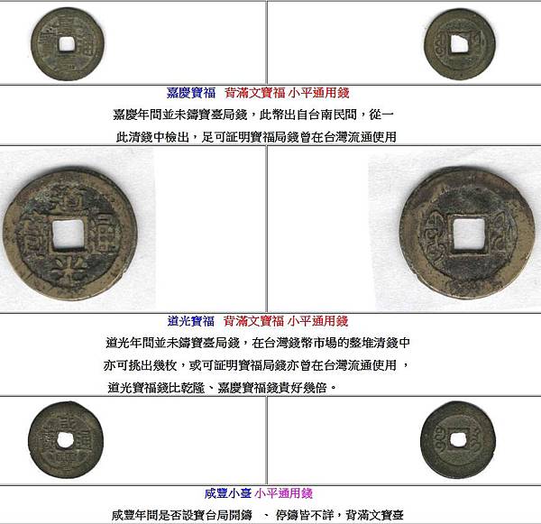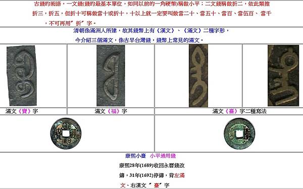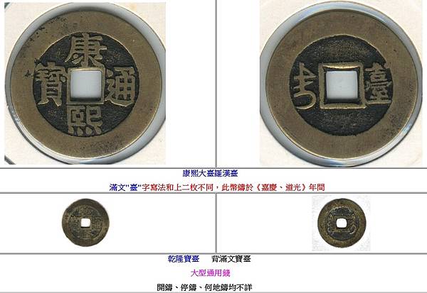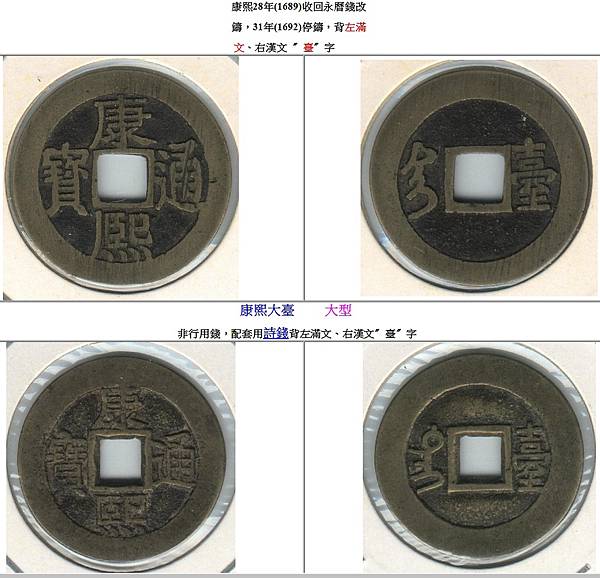 以後,清廷才在 台灣始鑄 《康熙通寶》寶台局,背左滿文、右漢文台之方孔制 錢。自