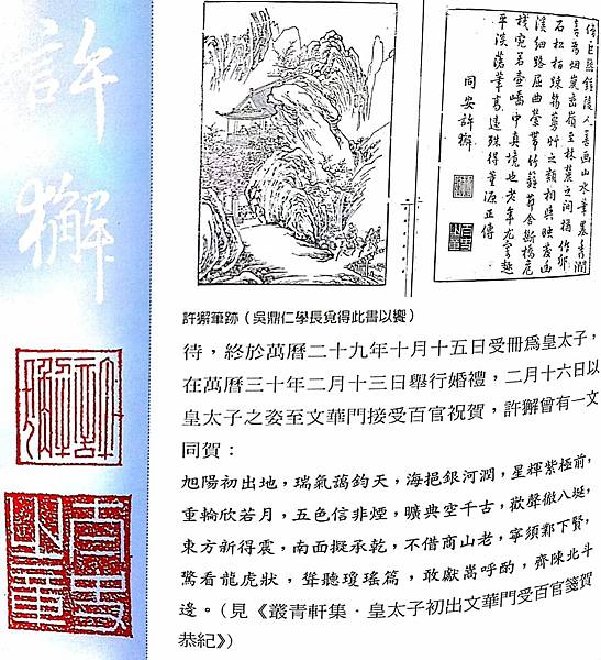 當然,許獬出生於明朝隆慶四年(西元一五七○年),卒於明萬曆三十四年(西元一六○六年),離開人世己超過四百年了,諸多的傳說在金、泉兩岸流傳,版本雜沓,甚至,部份情節明顯有穿鑿附會之嫌,如今著手寫此文,確已無法直接訪問、考證,只能參考其著作、史籍資料與相關報導。