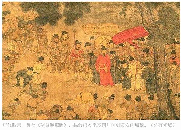 唐代時景。圖為《望賢迎駕圖》,描敘唐玄宗從四川回到長安的場景。(公有領域)