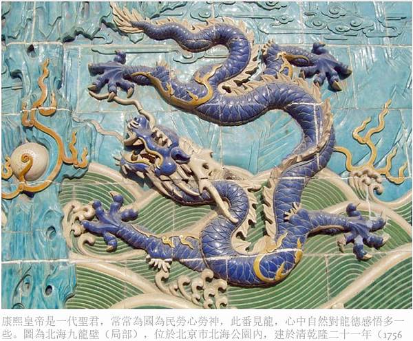 康熙皇帝是一代聖君,常常為國為民勞心勞神,此番見龍,心中自然對龍德感悟多一些。圖為北海九龍壁(局部),位於北京市北海公園內,建於清乾隆二十一年(1756年)。