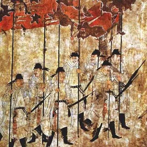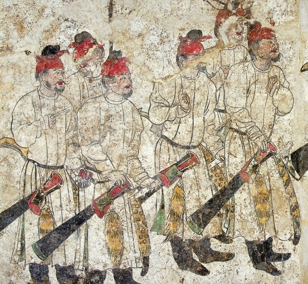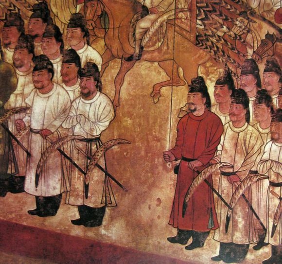 曾經有一些流傳很廣的圖片(其中主要是唐長樂公主墓的幾幅壁畫),這些壁畫里的帶甲武士身上,都掛有一個很長的直直的條狀物,看起來很像刀劍一類的東西。於是很多人在沒有任何根據及材料支持的的情況下,直接將其臆斷為唐代陌刀——這種沒有任何中國古代冷兵器常識的言論,讓我無法直視,甚至都不知道對此說啥好。