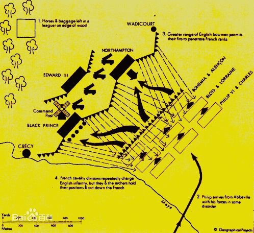 在 1346 年著名的克雷西戰役中,擁有兩萬多步兵、一萬兩千名重騎兵、一萬七千名輕騎兵,以及六千名熱那亞十字弩手的法軍,先後發起十餘次衝鋒,但最終還是敗於僅有七千多長弓手、四千多威爾斯步兵、五百多重騎兵的英軍手下。英軍擺出的陣形,與中國古代文獻里射遠兵種「左射右、右射左」這種交叉火力的設置理念完全一致,可見很多軍陣規則是中外一致、通用的。