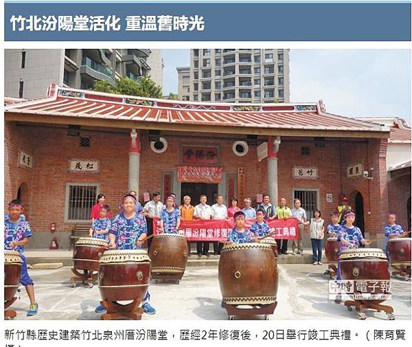 新竹縣文化局表示,竹北汾陽堂為一堂二橫屋規模的磚造三合院,建築工法嚴謹,可看出光復初期客家匠師工藝,具時代特色。【2013/05/09 聯合報】