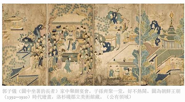 郭子儀(圖中坐著的長者)家中舉辦宴會,子孫齊聚一堂,好不熱鬧。圖為朝鮮王朝(1392─1910)時代繪畫,洛杉磯郡立美術館藏。(公有領域)