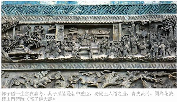 郭子儀一生富貴壽考,其子孫皆是朝中重臣,汾陽王人道之盛,青史流芳。圖為花戲樓山門磚雕《郭子儀大壽》