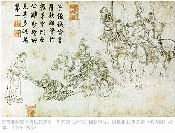 唐代名將郭子儀以其德望,單騎說服進犯的回紇軍隊。圖爲北宋 李公麟《免冑圖》局部。(公有領域)