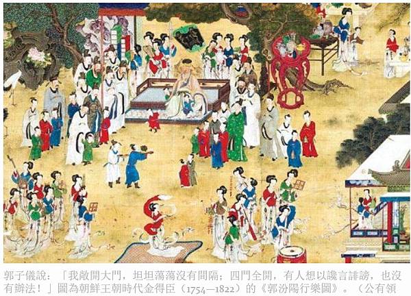 郭子儀說:「我敞開大門,坦坦蕩蕩沒有間隔;四門全開,有人想以讒言誹謗,也沒有辦法!」圖為朝鮮王朝時代金得臣(1754—1822)的《郭汾陽行樂圖》。(公有領域)