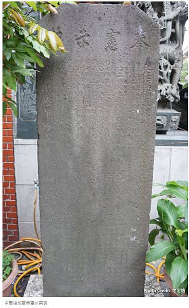勝訴的下游五庄拿到淡水知縣的曉諭後,歡天喜地,馬上請人刻成石碑,警告各方別打他們水源的主意。現在這面〈奉憲示禁〉石碑被立在市民大道四段71號中崙福成宮旁。由於是近年才被發現,重新立起的石碑,無法確定此處是不是當年立碑的原址。但中崙福成宮位在五庄之一的中崙庄,坐北朝南面臨大灣,是庄內的信仰中心,又是水圳的源頭,可說是相當合理的立碑處。