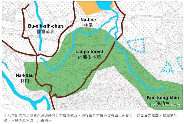 十八世紀大灣上游集水區與森林分布推測狀況,約相當於大安區信義路以南部分,包含台大校園。褐線為圳道,水藍色為河道,用來排水