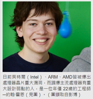 〔即時新聞/綜合報導〕日前英特爾(Intel)、ARM、AMD皆被爆出處理器晶片重大漏洞,而踢爆主流處理器有重大設計弱點的人,是一位年僅22歲的工程師─約翰‧霍恩(Jann Horn)。