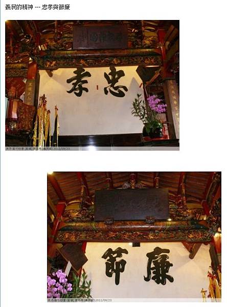清廷吏治班兵的腐化及民變動輒焚搶劫掠行為,義民挺身保鄉衛土以及捨身全義,在臺灣開墾史上,具有安定及推動發展之功