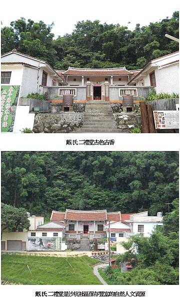 縣橫山鄉沙坑村戴氏二禮堂,為社區重要信仰中心,每年舉辦「謝祖禮」,周邊保留百年古井、白鷺鷥陴塘﹔經農村再生計畫,最近完成周邊環境改善,為竹縣增添一處新景點。