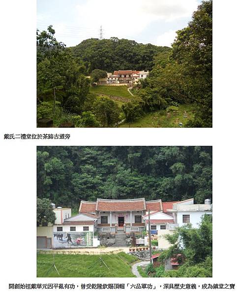 「二禮堂」位於茶路古道旁,來台祖華元公受乾隆皇帝勒封「軍功六品軍功之職」。戴氏堂號-有:「譙國 註禮 大夫第」,唯獨戴華元派下各組堂號為二禮堂。戴氏發源於河南陳留(商丘),譙國第六世祖戴德及第七世祖戴聖叔侄於漢朝初期在帝王京都為官,蒐集周朝典章規範制度一百八十篇,由戴德刪為八十五篇,稱為大戴禮記,又由戴聖刪為四十六篇,稱為小戴禮記。當時國家沒有法律,則以禮代法,以禮治國,故帝王封戴德,戴聖為經學家,因此大戴禮記,小戴禮記為戴氏先賢所編訂,後世奉為典範。