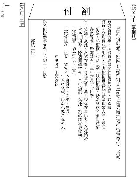 這件義民劄付,就是採用版框印刷的制式文書,類似現代的證明文件,是乾隆53年(1788)11月間,台灣的「林爽文事件」平定後,由福建巡撫徐嗣曾具名,發給參戰有功的「廣東嘉應州鎮平縣」籍義民戴華元的義民證書。內文除了說明奉旨過程外,我們也由此得知,已有部分賞給「翎頂職銜」的有功義民,已經在戰亂後分別授予「實缺補用」官職;至於其他應賞未賞,或已經賞給「頂帶」(頂戴)的義民,則須依據兵部的擬議,頒給憑證(印劄),並且逐一造具名冊,送往兵部存檔備查。