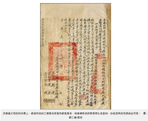 洪導常向我抱怨,始終無法完成有關父母的電影劇本,就是我一直在替他拉出支線的案外案,但白色恐怖就是如此荒謬。以他父母親的判決書為例,判決書最後列名的三個軍法官:審判長劉達,審判官陳英及審判官范明,軍法官都已預知,日後這些荒謬的案子會讓子孫蒙羞,因此像補教名師那樣用化名宣判。