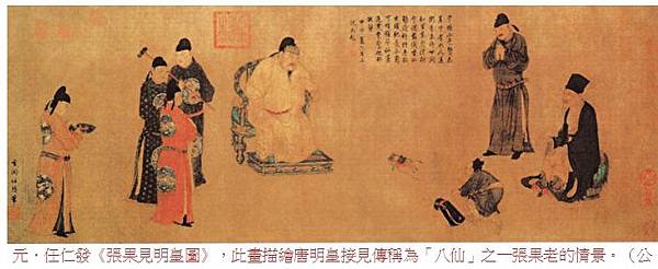 元.任仁發《張果見明皇圖》,此畫描繪唐明皇接見傳稱為「八仙」之一張果老的情景。(公有領域)