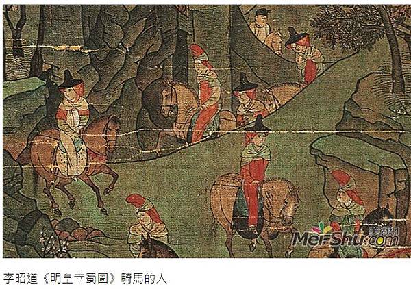 觀察這幅《明皇幸蜀圖》,不論從山石配置的左右對稱性,或嬪妃、仕女的頭飾、鬃馬等造型都承襲了中國古代傳統樣式,這些均可從唐代山水壁畫或出土的唐三彩人馬俑中發現類似的範例。不過,雖然這幅圖的祖本可能出自唐人之手,但經宋人輾轉反覆臨摹,現在看到的這幅《明皇幸蜀圖》已滲入了宋人對山水結構的理念。