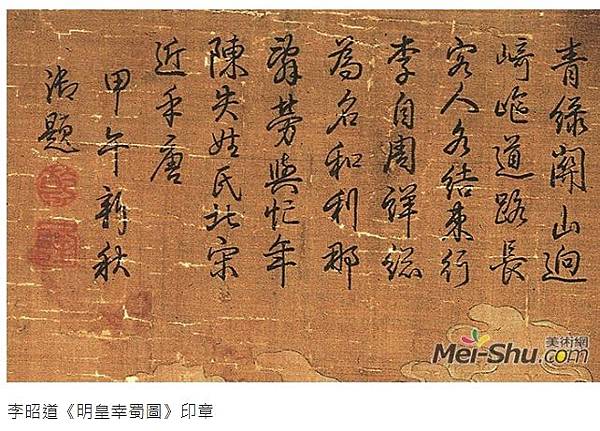 《明皇幸蜀圖》並非李昭道的原作,是接近二李風格的唐畫宋摹本。此圖描繪的是安史之亂時,唐玄宗李隆基丟了首都長安,逃往四川避難,在深山中行旅的情景。古代君王駕臨某地,稱「幸」。為了表示「幸」,儘管是出逃,卻也不能顯示出倉惶之意,所以畫上置身於青山綠水之中的人物個個衣冠楚楚,似正在「游春」一般。