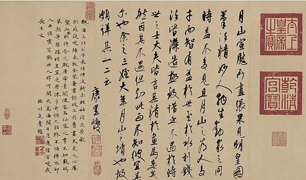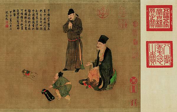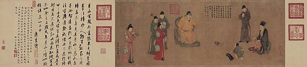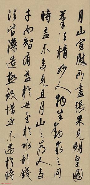 釋文:月山宣慰所畫張果見明皇圖,筆法精妙,人物生動。 求之同時蓋不多見,且月山之為人多才而智,有益於世。至於水利錢法皆深造極致,惜乎不遇於時。世之士大夫皆言其精於畫馬,是矣。然因其不遇但知此而不知彼,宜其爾也。余之三侄大年,月山之婿也,故頗詳其一二雲。康里巎