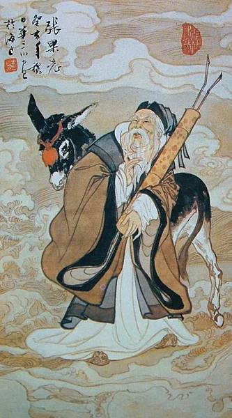 據張果老自稱,他是帝堯時代的侍中,到唐初,已活了三千多歲。他出入常乘一匹白驢,每倒騎之,日行萬里,休息時,便把這驢像紙一樣摺疊起來,置於巾箱中,乘則以水噴之,便又成了真驢。