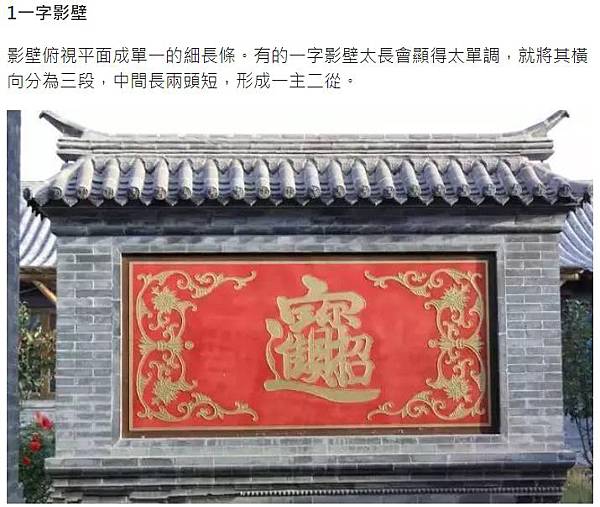 影壁俯視平面成單一的細長條。有的一字影壁太長會顯得太單調,就將其橫向分為三段,中間長兩頭短,形成一主二從。