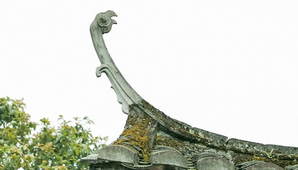 座山影壁。廂房的山牆上直接砌出小牆帽並做出影壁形狀,使影壁與山牆連為一體。