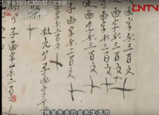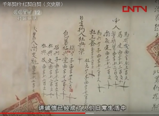 這種半書勘合的方法在今天中國的民間所建立合同中依然在繼續沿用。這種獨特的文字書寫方法,我們叫它“聯書字”。例如,在民間可以常常見到將“黃金萬兩”、“招財進寶”四個字豎向聯繫在一起書寫的,並且被稱為中國文字文化中一個很有趣的現象。我們可以說,契和約,合和同,也是我們中國悠久的歷史文化中的一個組成部分。當然,也是我國法律文化傳承過程中的一個重要的篇章。除了我們剛才說的這個形式以外,契約還可以通過早期的甲骨文,以及在鐘鼎、簋、盤等器物的上面記錄文字來加以表達。只是到了後來,隨著造紙術的發明,中國契約才有了顯著的飛躍。