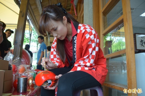 中田千尋現場彩繪達摩翁,希望略盡棉薄吸引觀光客,不僅代表日本與台灣二方的堅定友誼,更象徵傳遞達摩翁「不屈不撓」的精神。(記者王峻祺攝)