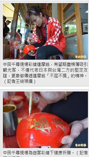 昨天上午天氣不錯,不少民眾造訪慶修院,現場有百尊達翁摩,由中田千尋當場彩繪。她表示,日本311大地震,台灣民眾熱心捐助和關懷,讓日本人相當感動,如今花蓮不幸遭逢強震,也希望透過達摩翁,為花蓮帶來祝福。