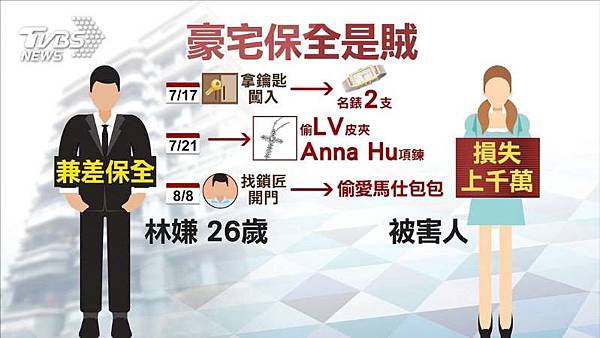 行竊的林姓保全,發現一戶夫妻出入打扮奢華,平常都把家中鑰匙放在鞋櫃,今年七月拿鑰匙闖入被害人家,偷走兩支名牌手錶,幾天後再次上門,偷走LV皮夾和價值120萬的鑽石項鍊,八月份又來,但發現鑰匙不在原本的地方,竟直接找鎖匠開門,得手愛馬仕包包,被害人估計損失上千萬。