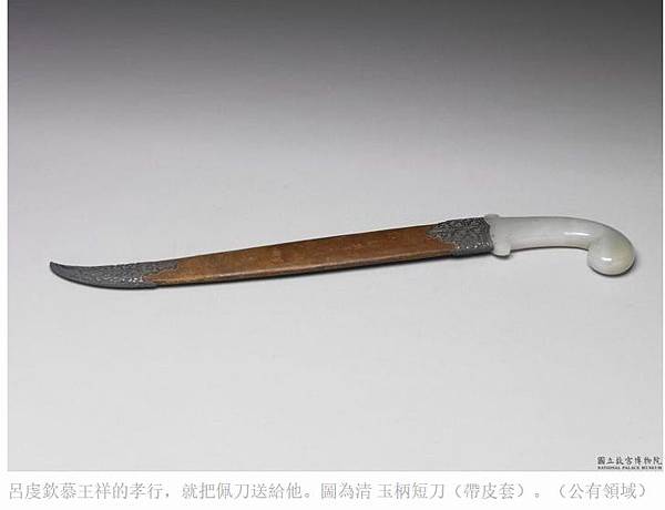 呂虔欽慕王祥的孝行,就把佩刀送給他。圖為清 玉柄短刀(帶皮套)。(公有領域)