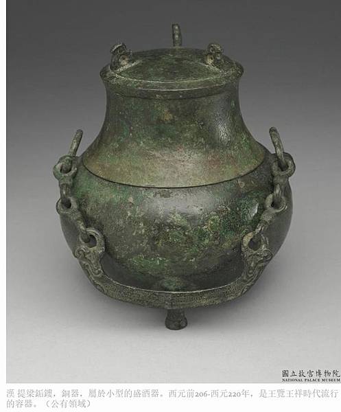 漢 提梁銗鏤,銅器,屬於小型的盛酒器。西元前206-西元220年,是王覽王祥時代流行的容器。(公有領域)