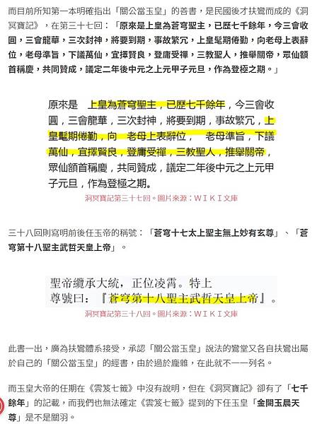 而目前所知第一本明確指出「關公當玉皇」的善書,是民國後才扶鸞而成的《洞冥寶記》,在第三十七回:「原來是上皇為蒼穹聖主,已歷七千餘年,今三會收圓,三會龍華,三次封神,將要到期,事故繁冗,上皇髦期倦勤,向老母上表辭位,老母準旨,下議萬仙,宜擇賢良,登庸受禪,三教聖人,推舉關帝,眾仙額首稱慶,共同贊成,議定二年後中元之上元甲子元旦,作為登極之期。」