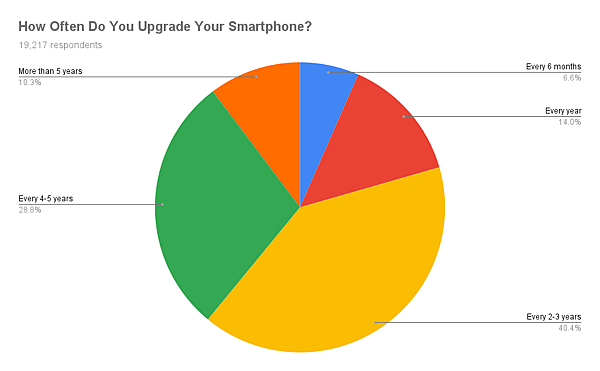 數據調查統計,在19,217位受訪者之中,有四成的用戶表示,持有手機在使用兩到三年內,會決定是否需要升級新機。此外,有將近三成的用戶則傾向持續使用長達四至五年,才會考慮換機。至於每一年都會換新機的用戶,則僅佔一成四的比例。