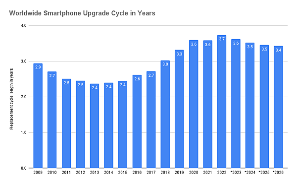 手機換機週期/手機更換週期-2023年全球智慧型手機用戶的平均換機週期約42個月/智慧手機目前的替換周期為31個月,在2014年則僅有23個月。明年,手機替換周期將增為33個月。