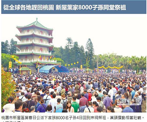 桃園市新屋區葉春日公派下家族,8000名子孫4日返回宗祠祭祖,號稱全台最多。子孫遍布海內外,大陸、美國、巴西、南非、紐西蘭,都有子孫趕回祭祖。葉春日公派下協進會理事長葉斯平說,家族凝聚力強,每年掃墓一定齊聚,更要後代不忘本。